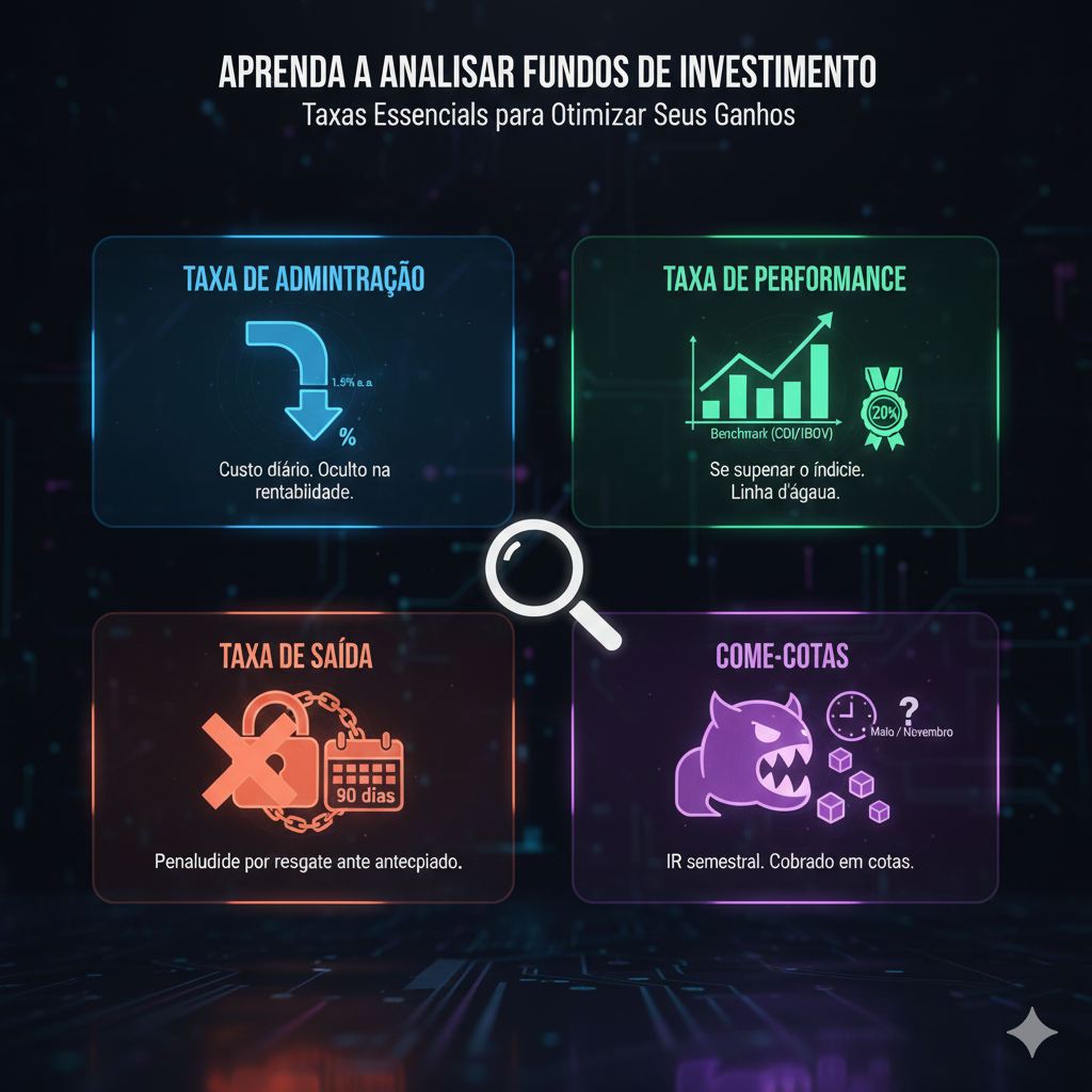 • O que é: Um percentual anual (ex: 1,5% a.a.) cobrado sobre o patrimônio total do Fundo (PL – Patrimônio Líquido).